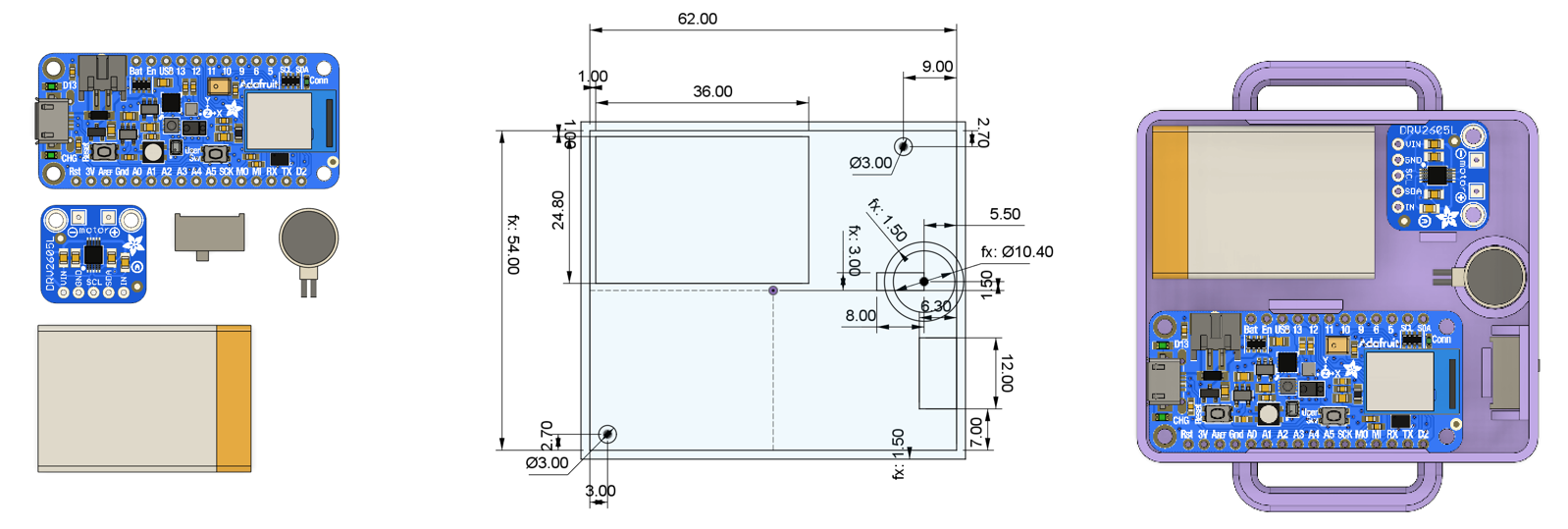 Figuur 2 links: losse componenten, midden: eerste schets om voor de indeling, rechts: componenten in behuizing