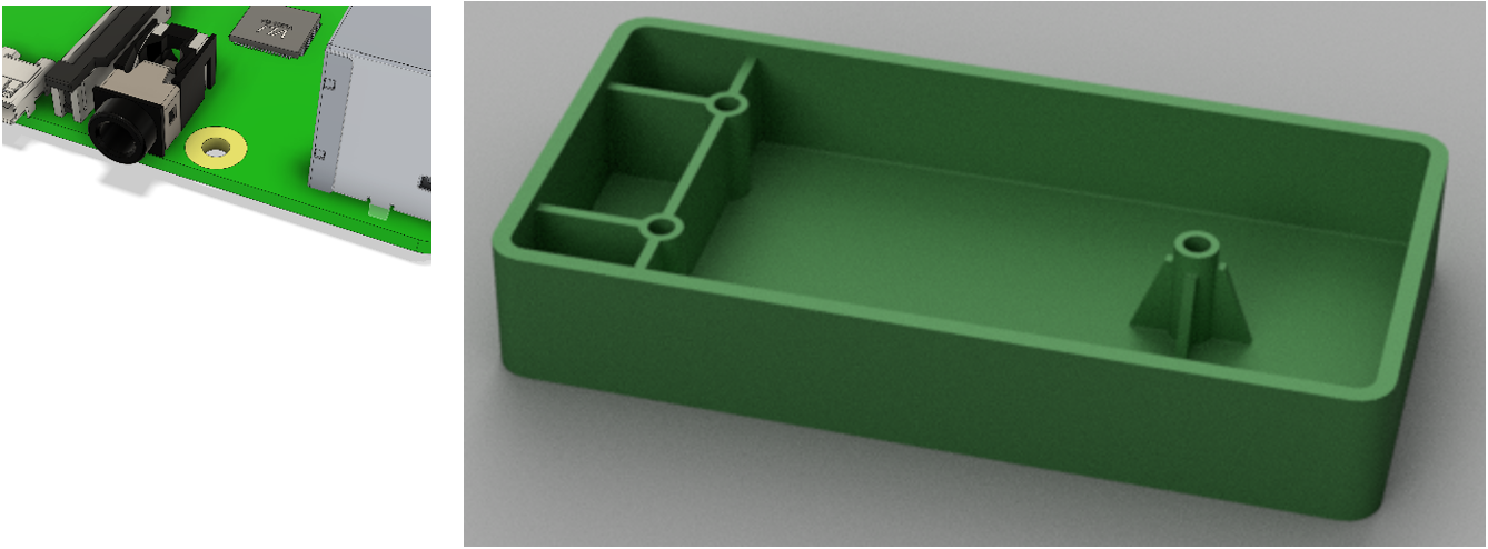 Figuur 8 links: bevestigingsgat in pcb, rechts: bossen met ribbels (links) en hoekverstevigingen (rechts)